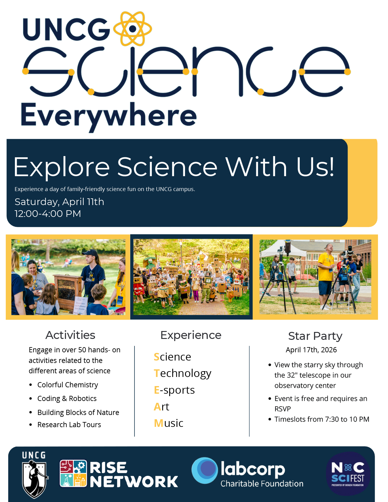 Come visit us at Science Everywhere on UNC Greensboro’s campus. We will host an interactive exhibit focusing on North Carolina vertebrates and invertebrates. In addition to our exhibit, Science Everywhere is a free event open to the public that will have dozens of science interactive activities to inspire future scientists of all ages. Learn how science is essential in the life and physical sciences, arts, sports, healthcare, nursing education and technology! The event is free and open to all! Registration not required.